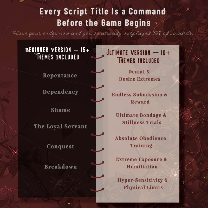 The Trilogy Set includes: three themed printed scripts + high-end SM apparel (eco-friendly, durable materials) + premium adult accessories (such as gags, whips, impact batons… and a variety of SM tools waiting to be unlocked)